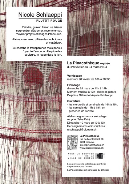 Nicole Schlaeppi, artiste et formatrice à Genève, offre des cours et stages pour tout public. A la retraite elle partage son temps entre les voyages, son atelier, la Hep et l’Unige où elle enseigne la didactique des arts plastiques comme outil créatif et d’apprentissage aux enseignants spécialisés.